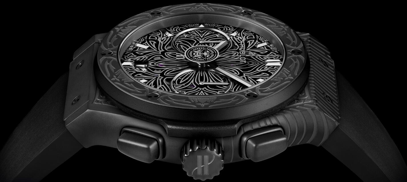 Presentato in una cassa da 45 mm di larghezza e 13,45 mm di spessore in ceramica nera micropallinata, l’Hublot Classic Fusion Aerofusion Chronograph All Black Shepard Fairey sfoggia uno speciale design inciso sul profilo della cassa, sulla parte superiore della struttura delle anse e su la sua lunetta e quadrante. Un motivo più spettacolare incontra la tavolozza dei colori più tenue, All Black, per creare un pezzo di contrasto straordinario. Il contrasto rimane il tema in tutto: superfici incise e lisce si susseguono, estendendo un’esperienza visiva in una tattile nel caso di questo speciale Aerofusion. Il fondello in vetro zaffiro rivela il movimento cronografo a carica automatica HUB1155 con 207 componenti, 60 gioielli e 42 ore di riserva di carica.